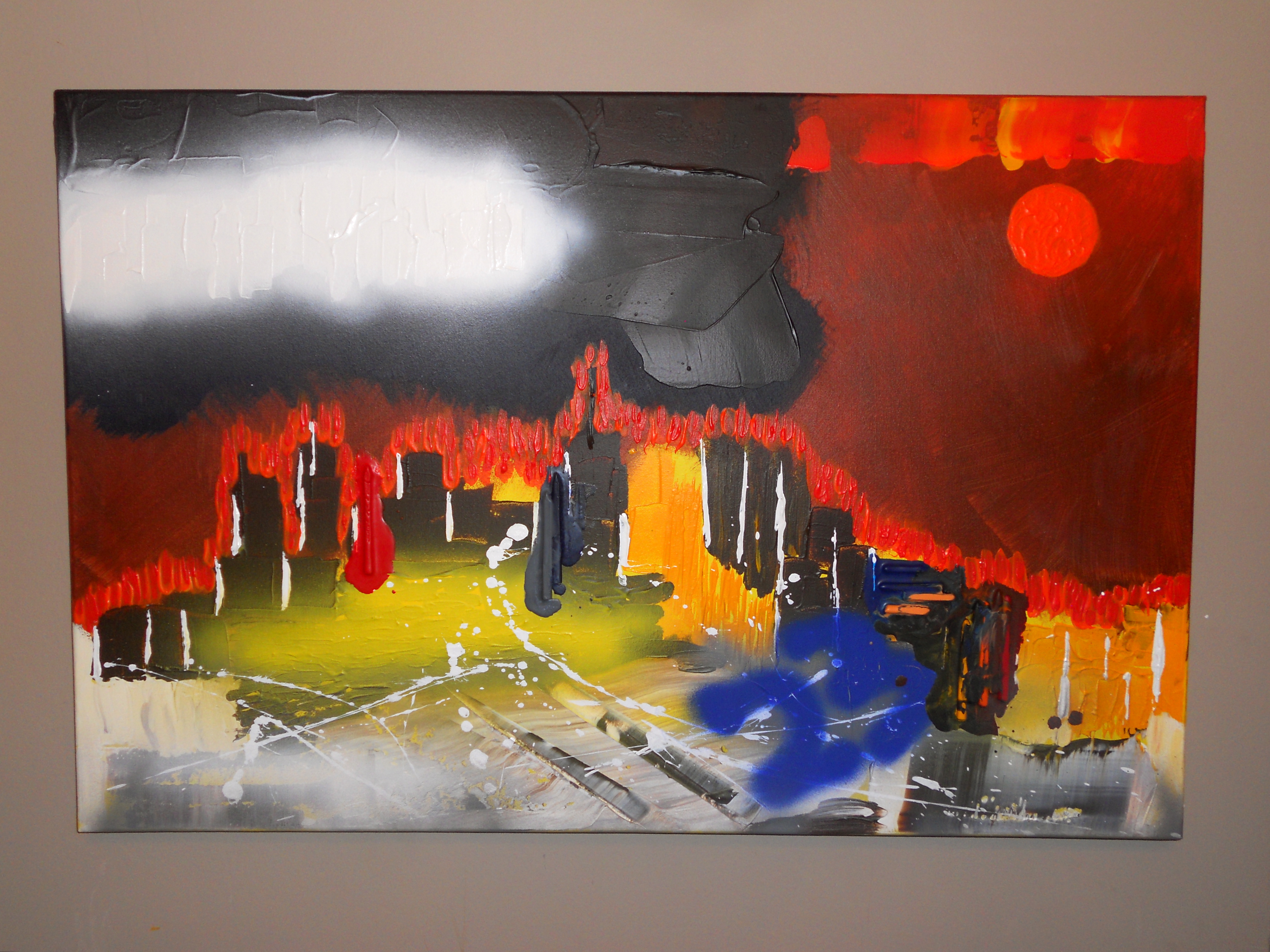 Lorin Russell 23 Burning – mixed media 3′ x 2′ (now in my living room!!!)